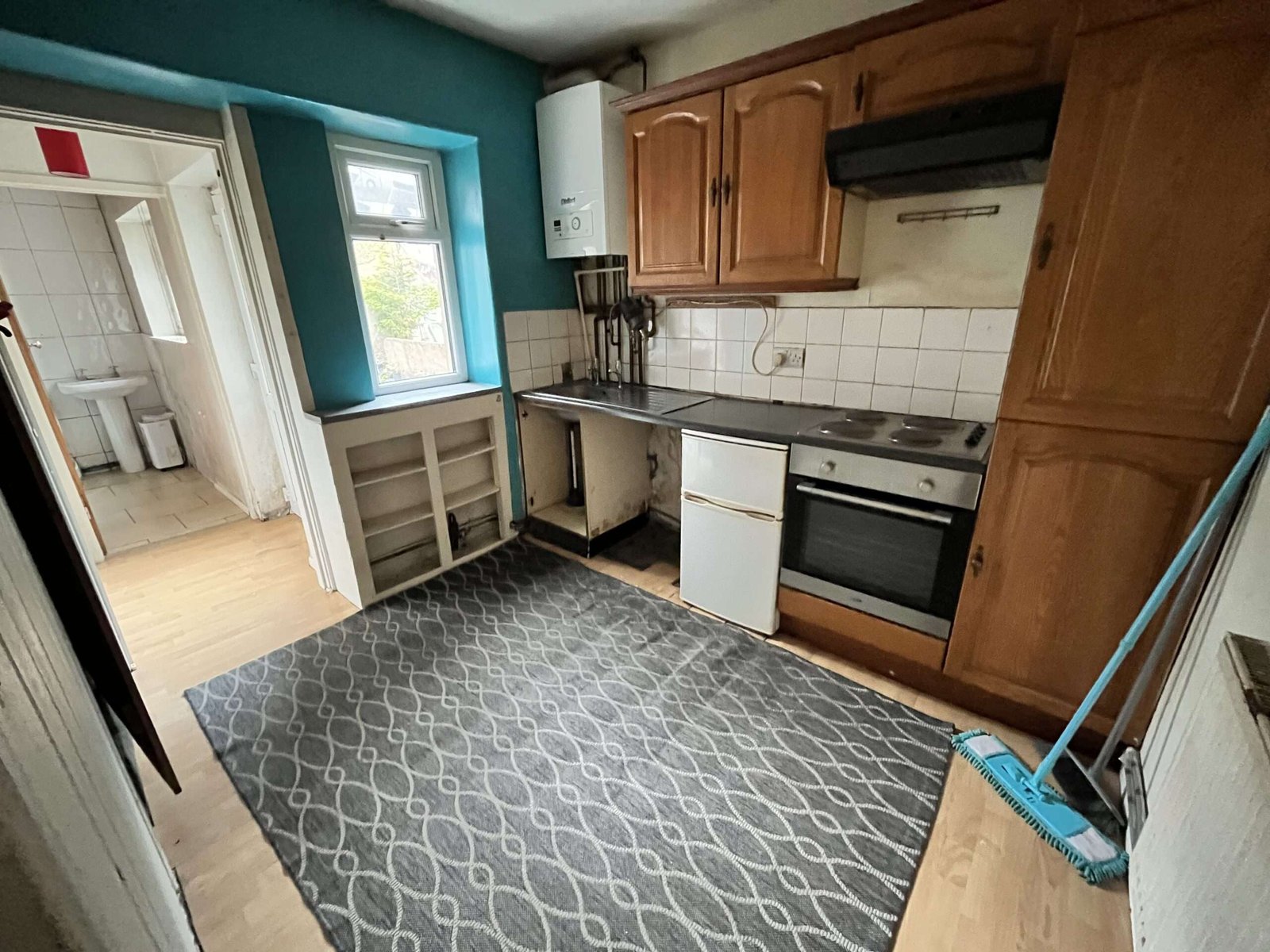 Double glazed uPVC window, double radiator, fitted units with room for free standing fridge freezer and washing machine, Valliant boiler, base units, integrated electric hob with extractor fan, integrated electric oven and stainless steel sink. Stairs up to bedrooms. Leading to: